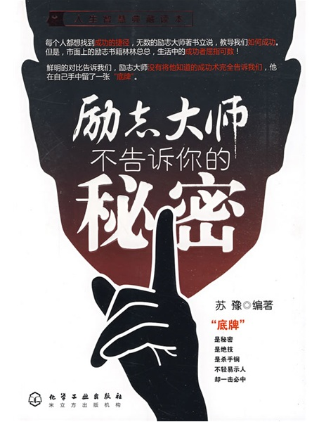 编辑推荐 每个人都想找到成功的捷径,无数的励志大师著书立说,教导我们如何成功。 但是,市面上的励志书籍林林总总,生活中的成功者屈指可数! 鲜明的对比告诉我们,励志大师没有将他知道的成功术完全告诉我们,他在自己手中留了一张“底牌”。 “底牌”,是秘密,是绝技,是杀手锏,不轻易示人,却一击必中。 猫教老虎技能,会留下“上树”这招防身·师傅教徒弟本事,会留下“底牌”来确保自己的饭碗·励志大师也一样,也有“不告诉大家的秘密”,而这些不告诉你的秘密恰恰才是决定人生成败的关键!摆在明面上的道理大家都懂,但这些道理就像路边的石头,无法砌出坚固、舒服的生活·藏在明面之下的道理不是所有人都懂,但是这些道理却是人生成败的关键! 本书为你揭示励志大师们不会说出的“成功秘密”,摒弃空泛的道理,长篇的说教,以直击核心的方式告诉你成功者必须具备的素质,成功者如何为人处世……点击免费阅读更多章节:励志大师不告诉你的秘密